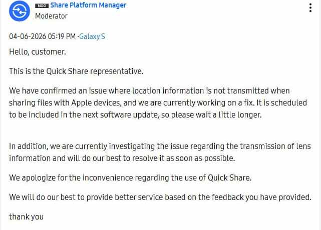 Samsung confirma error en Quick Share: Datos de metadatos se pierden al enviar archivos a iPhone