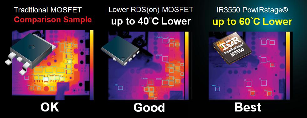 Resultados de pruebas solo para referencia. Los resultados varían dependiendo la configuración del sistema.*Hasta 60° C menor temperatura. Obtenidos usando 4 fases IR3550 PowIRstage® con 2x en Cobre para el PCB vs. 4 fases D-Pak MOSFET @ 100A con carga durante 10 mins en prueba de laboratorio sin disipador.