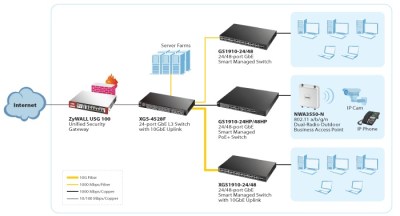 ZyXEL Communications Corp., proveedor de redes de banda ancha protegidas, productos de conectividad y routers, presenta sus nuevos Switches de Gestión Inteligente de las Series XGS1910 y GS1910, de 24 ó 48 puertos GbE, con 10GbE uplink opcional que permite obtener un máximo rendimiento para satisfacer las crecientes demandas de redes de las Pequeñas y Medianas Empresas (PyMEs). La Serie consiste en seis diferentes modelos – XGS1910-24, XGS1910-48, GS1910-24, GS1910-24HP, GS1910-48 and GS1910-48HP – que brindan 24 ó 48 puertos de cobre que soportan velocidades de transmisión 10/100/1000BASE-T PoE Plus o no-PoE. Los modelos XGS1910 ofrecen conectividad de 2/4 puertos 10GbE para uplinks o stacking con otros switches.