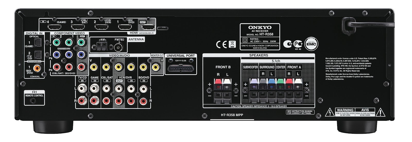 - HDMI® soporte para 3D, canal de Audio Return , DeepColor™, x.v.Color™, LipSync, Dolby® TrueHD, DTS-HD Audio Master™, DVD-Audio, Super Audio CD, multicanal PCM, and CEC