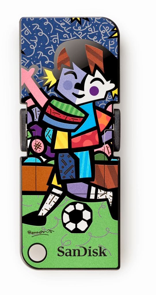 Conocido por sus obras de arte, coloridas y alegres, Britto desarrolló un diseño único usando el fútbol como inspiración. Este diseño estará incluido en nuestra línea de unidades flash USB Cruzer Pop de 8 GB1 y estará disponible para los consumidores latinoamericanos, con un precio de venta minorista sugerido de $119 pesos. La unidad también incluye el software SanDisk SecureAccess™, que brinda encriptación segura de archivos y protección con contraseña para archivos privados, mientras deja el resto de la unidad disponible para compartir el contenido sin preocupaciones2.