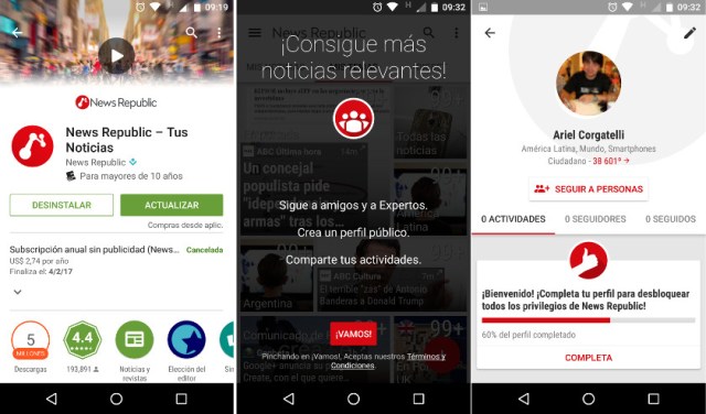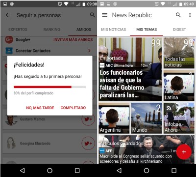 Hasta acá una breve introducción de News Republic. Ahora vayamos con las novedades de esta versión 6.0. La misma incorpora unos elementos sociales como los de poder compartir nuestro perfil; y que usuarios de la aplicación puedan seguirnos; y a su vez nosotros seguirlos.