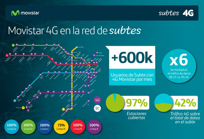 – En Mayo de este año, más de 600 mil clientes Movistar traficaron datos en el subte en la red 4G.