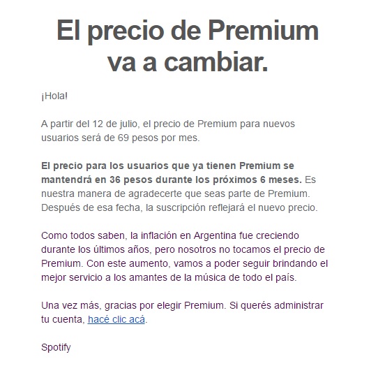 Como todos saben, la inflación en Argentina fue creciendo durante los últimos años, pero nosotros no tocamos el precio de Premium. Con este aumento, vamos a poder seguir brindando el mejor servicio a los amantes de la música de todo el país.
