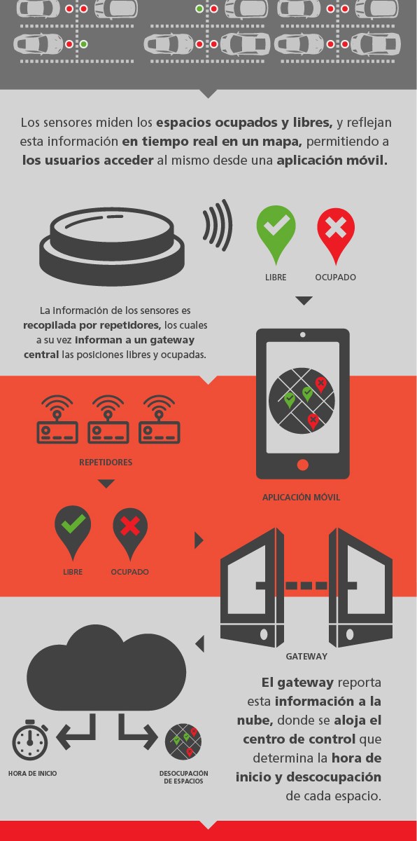 – Los sensores miden los espacios ocupados y libres, y reflejan esta información en tiempo real en un mapa, permitiendo a los usuarios acceder al mismo desde una aplicación móvil.