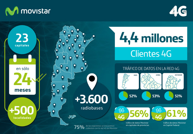 En materia de redes de comunicación, los clientes de Movistar gozan de la mejor conectividad de cuarta generación ya que, tras sólo 24 meses, todas las capitales de provincia están cubiertas con 4G, al igual que más de 500 ciudades en todo el país, la ciudad de Buenos Aires, y su red de subterráneos. La velocidad de despliegue de la red 4G en la Argentina es superior a la desarrollada por la compañía en Reino Unido y Alemania. Este dato reafirma el compromiso de Telefónica en el país y la vocación de trabajo de sus empleados.