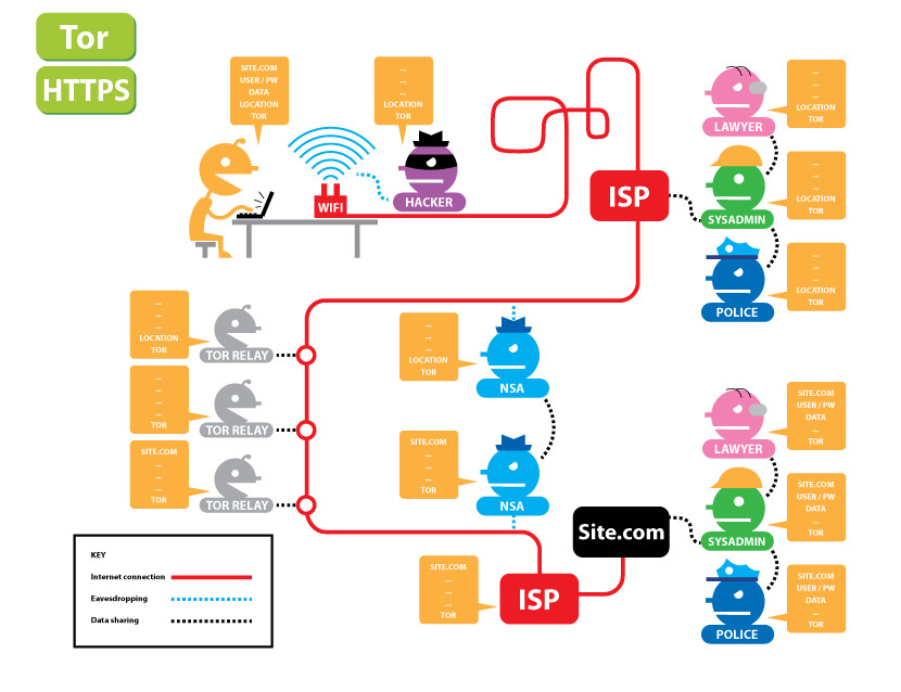 La Electronic Frontier Foundation (una organización sin fines de lucro que trabaja para defender la libertad en Internet) tiene un gráfico interactivo que permite conocer de forma más clara qué información compartimos con nuestros ISP (y hackers que puedan estar mirando nuestras conexiones) si usamos HTPPS y Tor en esta página.