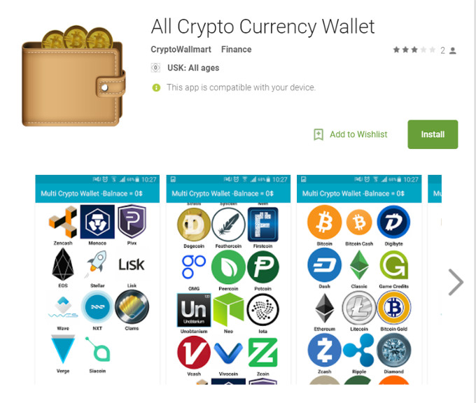 La aplicación “All Crypto Currency Wallet” se presenta como una billetera para múltiples monedas. A primera vista parece muy práctica, pero en lugar de ser una solución conveniente, roba cualquier criptomoneda que se le envía. La aplicación trae incluso una ventaja adicional para su desarrollador: un enlace a Changelly, un servicio que ayuda a los poseedores de criptomonedas a cambiarlas a la mejor tasa posible. Si los usuarios de la aplicación pulsan este enlace y cambian sus criptomonedas usando Changelly, el desarrollador “CryptoWallmart” obtiene el 50% de los ingresos de Changelly.