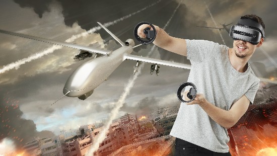 Lenovo Explorer (2) – Edited Two UAV / drones descend into the chaotic landscape of a war torn city. This is an original digital illustration combining 3d and image editing techniques.