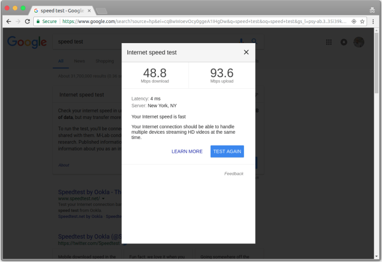En tiempo real, podras ver un applet web que hace una prueba de tu velocidad de carga y descarga. Una vez completada la prueba, podras ver los resultados de la misma, la ubicación del servidor que se utilizó en la prueba de velocidad, un poco de información sobre la velocidad de tu red, incluyendo lo que debería poder hacer (como transmitir videos HD) y te ofrece la posibilidad de volver a ejecutar la prueba. Los resultados de la prueba realizada en nuestra oficina en la ciudad de New York es la siguiente:
