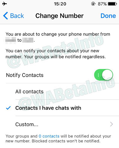 Desde nuestro smartphone ingresamos a Ajustes -> Cuenta -> Cambiar Número. Luego ingresamos nuestro número actual, y nuestro nuevo número de teléfono para realizar el cambio. La novedad en la nueva versión es que el mismo sistema nos consulta si queremos realizar el aviso a todos nuestros contactos, y esta tarea la realiza de forma automática.