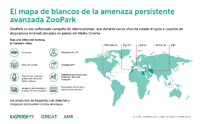 Los investigadores de Kaspersky Lab han descubierto ZooPark, una sofisticada campaña de ciberespionaje que durante varios años ha estado dirigida a usuarios de dispositivos Android ubicados en varios países del Medio Oriente. La campaña, que emplea sitios web legítimos como fuentes de infección, parece ser una operación respaldada por un estado o nación que se dirige a organizaciones, activistas, organizaciones políticas y otros objetivos con base en la región (Fuente Kaspersky Lab).