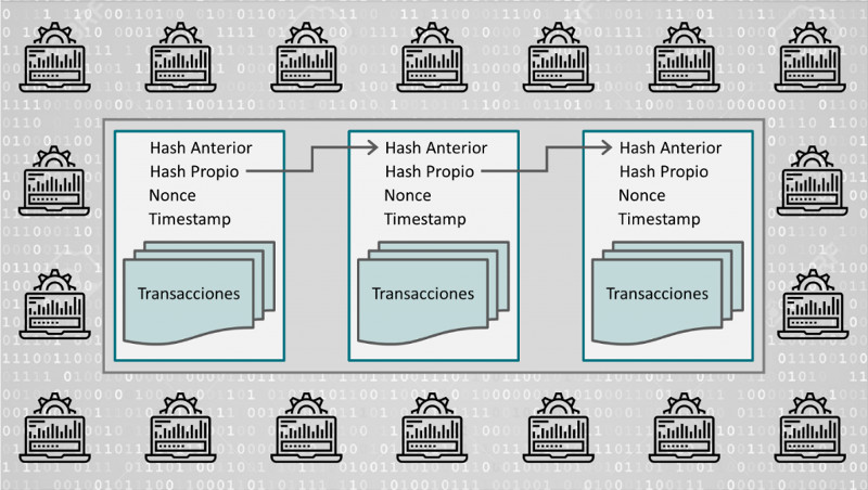 En cada bloque se almacena una cantidad de registros o transacciones válidas, información referente a ese bloque, su vinculación con el bloque anterior y el bloque siguiente a través del hash de cada bloque ─un código único que sería como la huella digital del bloque. Cada bloque tiene un lugar específico e inamovible dentro de la cadena. La cadena completa se guarda en cada nodo de la red que conforma la blockchain, por lo que se almacena una copia exacta de la cadena en todos los participantes de la red.