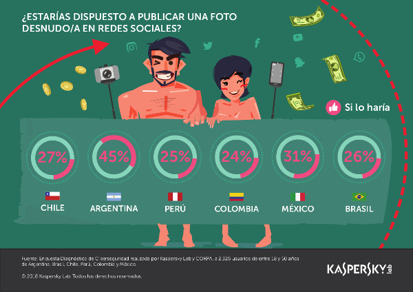 En relación a este último dato, el 30% de los latinoamericanos estaría dispuesto a publicar una foto desnudo en redes sociales por dinero, de los cuales un 44% corresponde a hombres y solo un 17% a mujeres. En este ítem, los argentinos son quienes llevan la delantera, con un 45% de internautas dispuestos a hacerlo, seguidos por mexicanos (31%) y chilenos (27%). Más abajo se encuentran Brasil (26%), Perú (25%) y Colombia (24%).