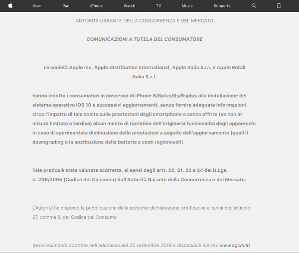 La noticia de hoy es que la web oficial de Apple Italia debió publicar al final de la misma un mensaje donde se explica todo lo sucedido al respecto.