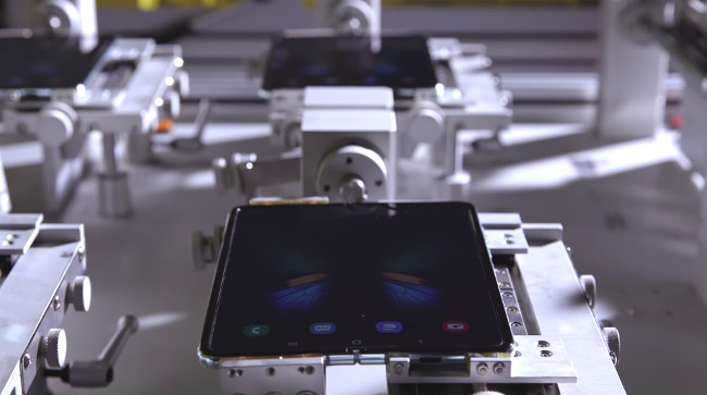 Naturalmente, dado el diseño del teléfono inteligente, una prueba de plegado fue una parte fundamental de la evaluación de la durabilidad del Galaxy Fold. Esta prueba, que examina si el Galaxy Fold puede durar más de 200,000 pliegues y desarrollos (o alrededor de cinco años de uso, si se usa 100 veces al día), toma una semana completa para completarse. Si bien el alcance de la prueba puede parecer excesivo para algunos, Samsung lo consideró vital para garantizar la durabilidad del diseño articulado del dispositivo y la pantalla Infinity Flex.