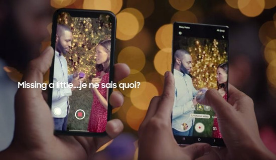 En este caso nos encontramos con dos personas; por un lado una mujer tiene en sus manos el Samsung Galaxy Note 10 y su compañero un iPhone. Ambos están grabando a otra pareja en plena propuesta de matrimonio; mientras ella hace uso del efecto bokeh para grabar el momento, el hombre, al ver que ella puede editar el efecto, deja de utilizar el iPhone con cara de designación.