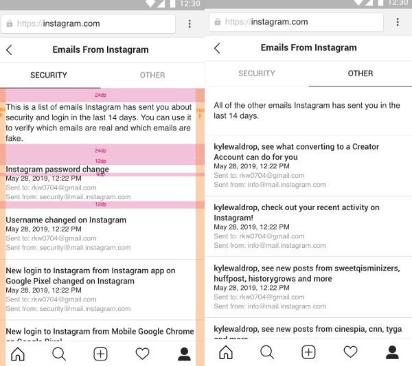 - Una pestaña «Otro» que muestra una lista de todos los otros correos electrónicos que Instagram ha enviado en los últimos 2 días que no están relacionados con la seguridad de la cuenta.