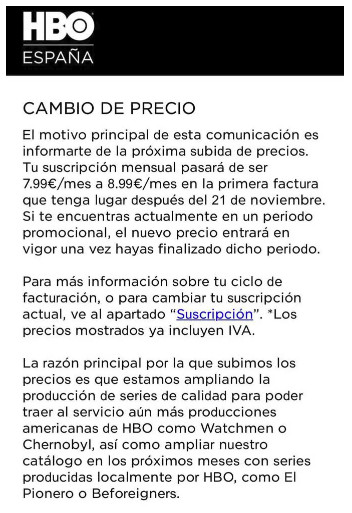 Todo comenzó cuando HBO anunciaba hace un mes que iba a reducir a la mitad el periodo de prueba gratis de la plataforma, que pasaba a ser de sólo 14 días. Ahora, la compañía está comunicando a sus usuarios que la subida de precio será de un euro en el próximo ciclo de facturación, pasando de 7,99 a 8,99 euros al mes.