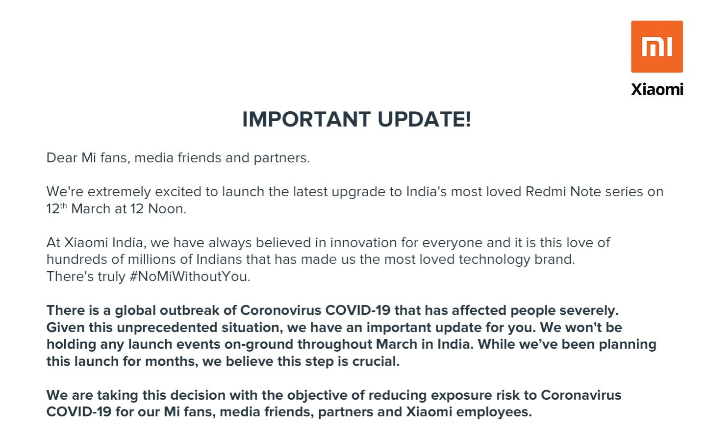 Hoy, Manu Kumar Jain, el Director Gerente de Xiaomi India reveló que la compañía está cancelando su evento de lanzamiento de Redmi que estaba programado para el 12 de marzo, por culpa del coronavirus. En su lugar, organizará un lanzamiento solo en línea que será realmente «digno de mención».