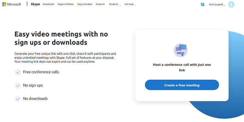Meet Now admite llamadas de videoconferencia gratuitas y no requiere una cuenta de Microsoft para comenzar. La función de Skype funciona directamente en el navegador, por lo que no tiene que instalar una aplicación. Una pulsación de botón es suficiente para crear una reunión gratuita e invitar a otros.
