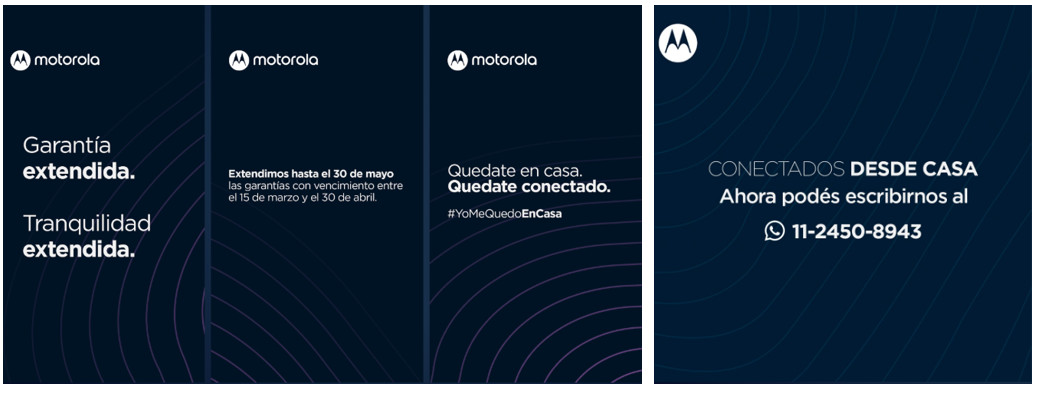 Manteniendo al consumidor siempre en el centro de la estrategia de la compañía, Motorola anunció que durante este desafiante momento por la pandemia de COVID-19, la compañía reforzará el soporte de servicios a los usuarios con el fin de minimizar cualquier impacto potencial, a través de diversas acciones (Fuente Motorola Argentina):