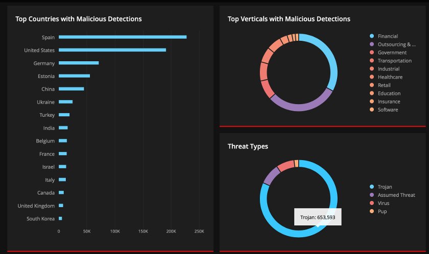 El ranking mundial de las naciones que recibieron mayores amenazas está integrado, de mayor a menor, por España, Estados Unidos, Alemania, Estonia, China, Ucrania, Turquía, India, Bélgica y Francia. Entre las principales áreas empresariales que sufrieron estos embates se ubican sectores como el financiero, outsourcing y hosting, Gobierno, transporte, Industrial y salud, entre otros.