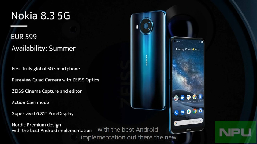 El 8.3 5G debutará como el primer teléfono 5G de HMD y está construido alrededor de una pantalla LCD de 6.81 pulgadas, Snapdragon 765G y una configuración de cámara cuádruple con un lente primario de 64MP. Tiene una batería de 4.500 mAh y parece venir en un solo color Polar Night.