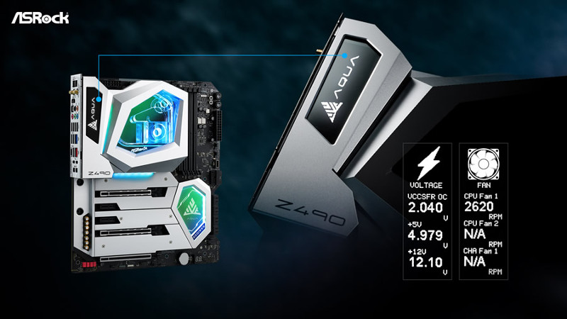 Lo que distingue el diseño del Z490 es una brillante pantalla OLED incorporada destacada en la placa base para que los usuarios obtengan informes de estado sobre el voltaje de la CPU, la temperatura, la velocidad del ventilador del sistema, el estado del sistema. Los coloridos tonos verdes, blancos y azules reflejan una mejora técnica en la placa base con acabado negro mate y metal.