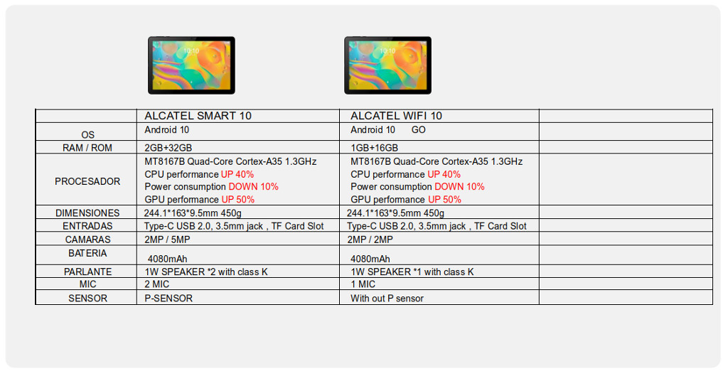 - Alcatel Smart 10 con Teclado: cuenta con la última versión de Android 10, 32gb, 2ram, 40% en mejora de la performance de la CPU, menos consumo de batería, diseño horizontal, 2 parlantes y 2W speaker. Precio sugerido de venta : $20.999