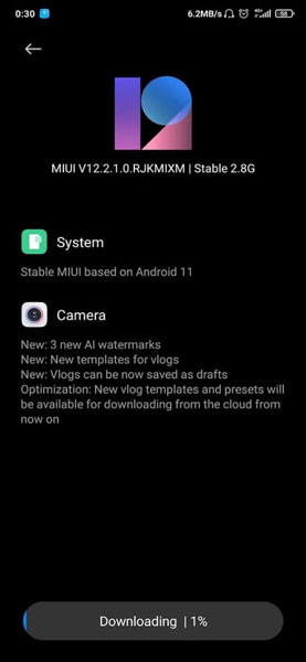 El nuevo Android 11 viene con la versión de firmware MIUI V12.2.1.0.RJKMIXM e implica una descarga de 2.8GB. El registro de actualización es bastante corto: trae «MIUI estable basado en Android 11» y algunas plantillas de cámara, marcas de agua y funciones de vlog.