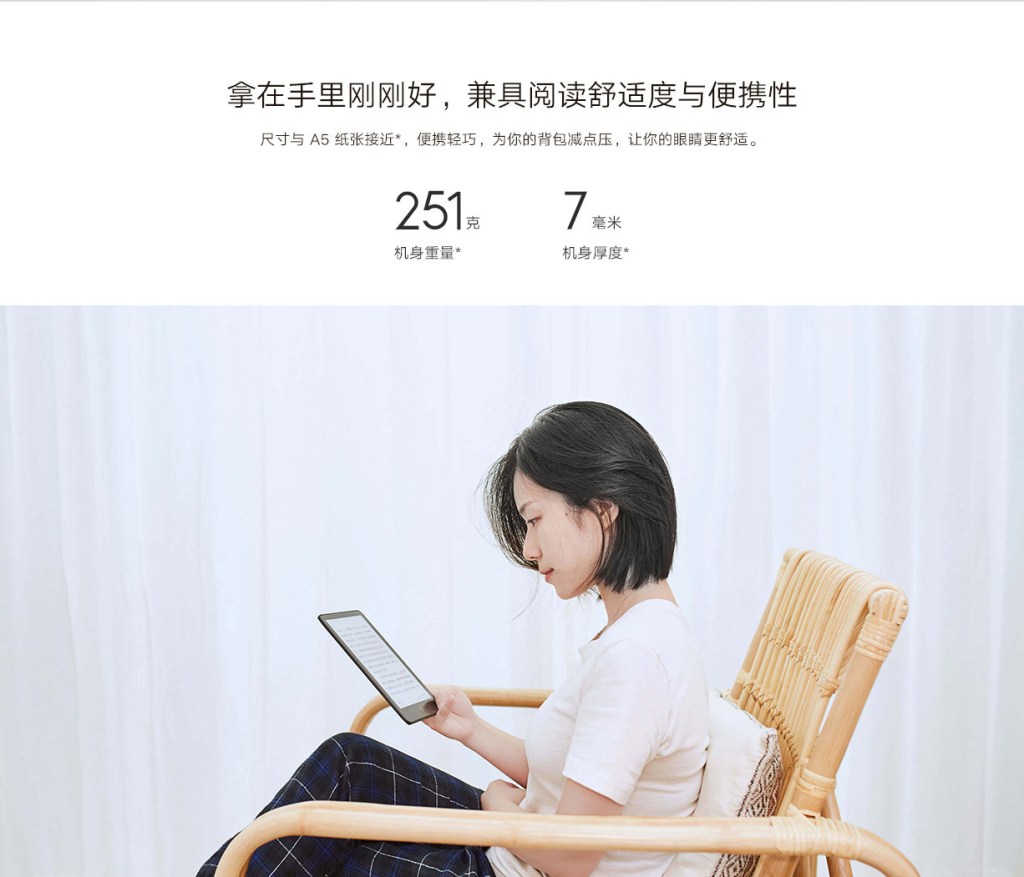 La pantalla es de 7.8 ”en diagonal con una pantalla de tinta electrónica y una densidad de píxeles de 330 ppi. El LED de iluminación de la pantalla viene con un brillo ajustable de 24 niveles y la capacidad de cambiar el tono de color de cálido a frío, según el entorno, lo que permite una experiencia de lectura más cómoda.