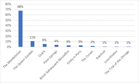 Durante las primeras tres semanas de enero, observamos que 275 usuarios sufrieron intentos de ataques utilizando archivos con diversas amenazas disfrazadas con los nominados a mejor película. Los investigadores de Kaspersky descubrieron que “The Mandalorian” era el anzuelo más popular entre los ciberdelincuentes, y representaba el 68% de los ataques. La exitosa serie de Netflix «The Queen’s Gambit» ocupó el segundo lugar en esta clasificación con el 11% de los usuarios infectados y «Ozark» completó los tres primeros con el 6% de los usuarios.