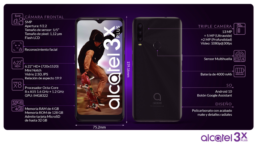 El Alcatel 3X Plus viene equipado con un procesador octacore, Android 10, 128GB de memoria de almacenamiento y 4GB de memoria de procesamiento. Tiene una pantalla inmersiva de 6,22 pulgadas y resolución HD+, Mini Notch 720 x 1520 pixels y display de 19:9.