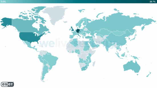 El mapa de calor muestra la distribución geográfica de las detecciones de webshell, según la telemetría de ESET.