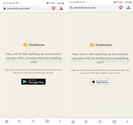 ESET advierte que incluso antes de presionar el botón para acceder a la aplicación se identifican algunos indicios de que algo está fuera de lugar. Por ejemplo, la conexión no se realiza de manera segura (HTTP en lugar de HTTPS) o el sitio utiliza el dominio de nivel superior «.mobi» (TLD), en lugar de «.com». tal como utiliza la aplicación legítima. Otra señal es que, aunque Clubhouse está planeando lanzar pronto la versión para Android de su aplicación, la plataforma sigue estando disponible solo para iPhones.