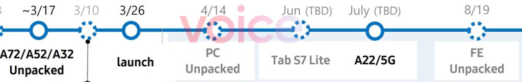 Se ha filtrado la mini hoja de ruta de Samsung para los próximos cinco meses de lanzamientos de productos. El conocido filtrador Evan Blass compartió la hoja de ruta en una publicación de blog en su plataforma ‘Voice’. La línea de tiempo muestra el evento Unpacked para el Galaxy A72, A52 y A32, y un próximo anuncio de Tab S7 Lite en junio.