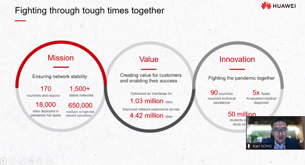A lo largo del último año, el negocio empresarial de Huawei intensificó sus esfuerzos para desarrollar soluciones innovadoras con base en escenarios para diversas industrias y para crear un ecosistema digital que prospera gracias a la creación conjunta y el éxito compartido. Durante la pandemia, Huawei ha brindado soluciones y experiencia técnica que han resultado esenciales en la batalla contra el virus. Entre los ejemplos, destaca la solución de diagnóstico asistida por inteligencia artificial y basada en HUAWEI CLOUD que ha ayudado a hospitales de todo el mundo a reducir la carga sobre la infraestructura médica. Huawei también ha colaborado con sus socios en el desarrollo de plataformas de aprendizaje en línea basadas en la nube para más de 50 millones de estudiantes de primaria y secundaria.