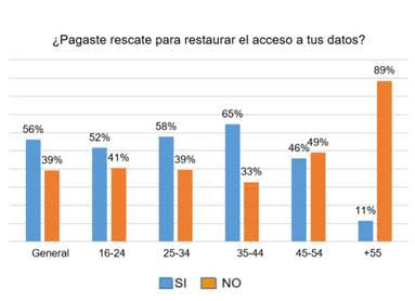 El año pasado, el porcentaje de víctimas globales que pagó el rescate para restaurar el acceso a sus datos fue más alto entre las personas de 35 a 44 años con 65% que admitió haber pagado. Esto se compara con poco más de la mitad (52%) de las personas de 16 a 24 años y solo el 11% de las personas mayores de 55, lo que muestra que los usuarios más jóvenes son más propensos a pagar un rescate.