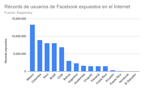 Según el análisis de Kaspersky, la mayor cantidad de datos de Facebook filtrados en la región provienen de usuarios en México, Colombia, Perú, Brasil y Chile. Sin embargo, al analizar el número de datos expuestos en relación al número de usuarios de Facebook por país, los más impactados son los usuarios de Uruguay, Panamá, Costa Rica, Chile y Bolivia (gráfico inferior).
