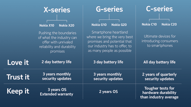 La serie X, gama premium de Nokia, serie G la intermedia y serie C de nivel básico, ofrecen la experiencia de calidad que los consumidores esperan de la compañía móvil europea. Productos que están construidos para durar por dentro y por fuera gracias a su seguridad líder en la industria, durabilidad superior, y la promesa de proporcionar el software más reciente, para que puedas mantener tu teléfono por más tiempo.