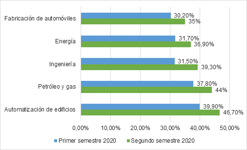 De todos los sectores analizados por los investigadores de Kaspersky, aquellos que tuvieron el mayor porcentaje de equipos ICS atacados fueron el de automatización de edificios, con un 46,7% y un aumento de casi 7 puntos porcentuales respecto al primer semestre de 2020; el de petróleo y gas, con un 44% y un aumento de 6,2 puntos desde el primer semestre; y el de ingeniería e integración de ICS, con un 39,3% y un aumento de unos 8 puntos porcentuales. En las industrias de petróleo y gas y de automatización de edificios, las amenazas llevan aumentando desde el primer semestre de 2019. Por su parte, las otras dos industrias analizadas por Kaspersky (energía y fabricación de automóviles) también experimentaron un aumento en el porcentaje de equipos ICS en los que se bloquearon objetos maliciosos.