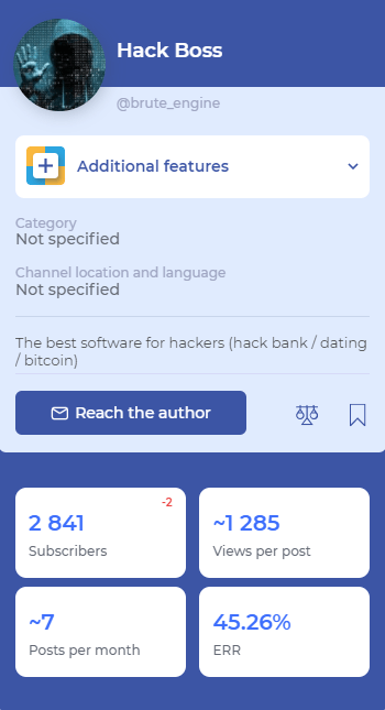En su canal, los autores publican posteos que promueven la piratería o descifrado de aplicaciones, pero lo que la gente obtiene cuando descargan estas aplicaciones es el malware HackBoss y no las aplicaciones que pensaban que estaban obteniendo. Esto se debe a que la publicación contiene una descripción falsa de la supuesta funcionalidad de la aplicación y capturas de pantalla de la interfaz de usuario de la aplicación. A veces también incluye un enlace a un canal de YouTube (actualmente eliminado), llamado Bank God con un video promocional.