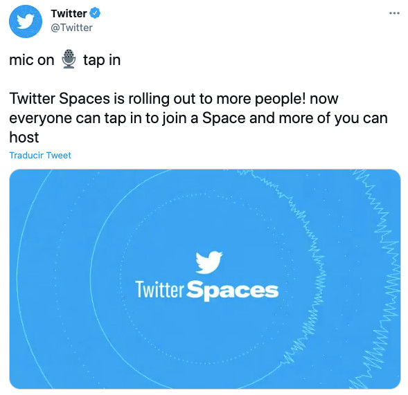 El año pasado se presento Espacios: conversaciones de audio en directo en Twitter. Desde entonces, se ha estado construyendo y probando con un grupo limitado de personas, y se ha descubierto que escuchar las voces de la gente da vida a las conversaciones en Twitter de una manera completamente nueva.