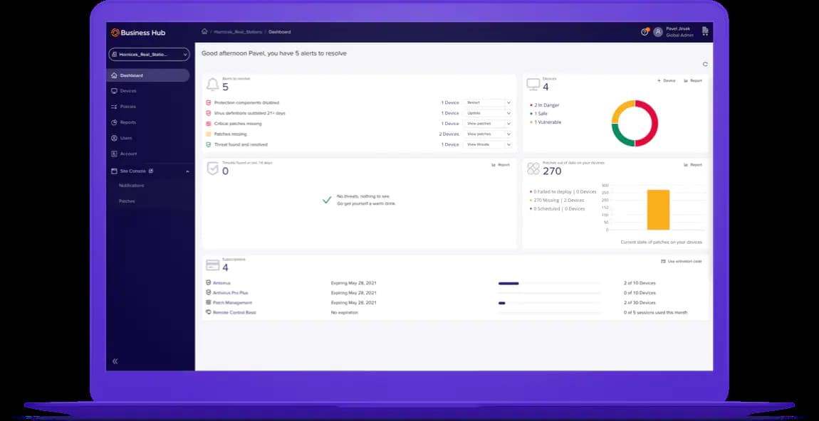Avast Business Hub consolida una serie de capacidades críticas de seguridad y disponibilidad para pequeñas y medianas empresas (PYMES). Esta consolida soluciones de protección de endpoints, administración de parches, copias de seguridad y recuperación de datos, y de soporte y acceso remoto en una plataforma de seguridad integrada que permite a las organizaciones administrar y proteger fácilmente sus dispositivos, aplicaciones, datos y redes. La plataforma combina soluciones de seguridad de red y protección de terminales basadas en la nube que son fáciles de implementar y administrar, lo que reduce los gastos generales y los costos, al mismo tiempo que brinda la protección más completa.