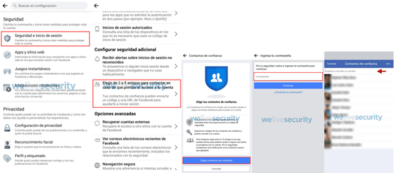 Pie de imagen: Configuración de seguridad adicionales en Facebook y opción de contactos de confianza en Facebook.
