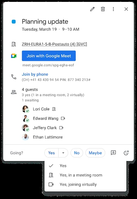 Las empresas y las oficinas han comenzado a implementar modelos híbridos que implican trabajar desde casa pero también desde una oficina en algunas situaciones. Para adaptarse a este futuro híbrido, Google ha actualizado su función RSVP para Calendar con dos nuevas opciones (Fuente Google).
