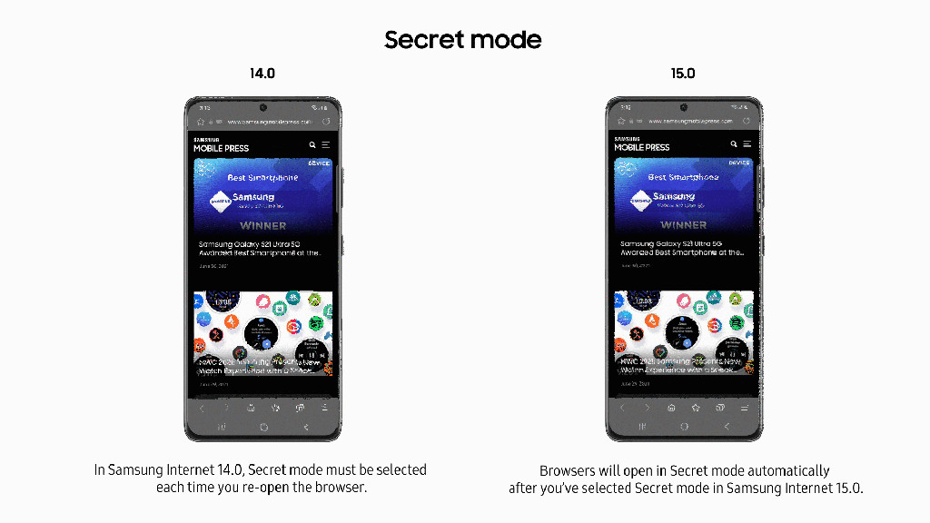 - Samsung Internet 15.0 beta permite a los usuarios eliminar los datos almacenados en sus dispositivos y proporciona una mayor comprensión de lo que se eliminará. Además, una vez que el usuario activa el modo Secreto, el navegador permanece en modo Secreto por defecto, eliminando pasos adicionales para activar el modo cada vez.
