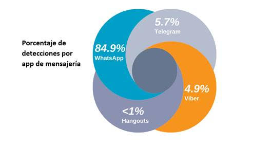 Según estadísticas, Viber y Hangouts recibieron una menor cantidad de detecciones registradas. La diferencia clave entre ellos es la representación regional. El mayor número de detecciones en Viber fue identificado principalmente en Rusia, con 89%, y los países de la CEI – Ucrania 5% y Belarús (o Bielorrusia) 2% – y la mayoría de las detecciones de Hangouts fueron de EE.UU. (39%) y Francia (39%).
