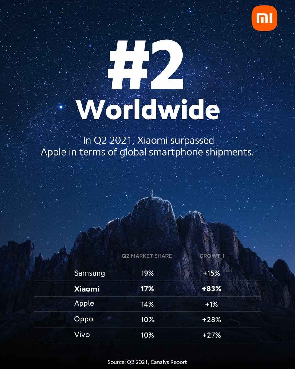 Canalys, la firma líder en investigación de mercado global, lanzó su informe de mercado global de teléfonos inteligentes del segundo trimestre en el que Xiaomi ocupó el segundo lugar con una participación del 17% y un crecimiento interanual del 83%, superando a Apple (Fuente Xiaomi Global).